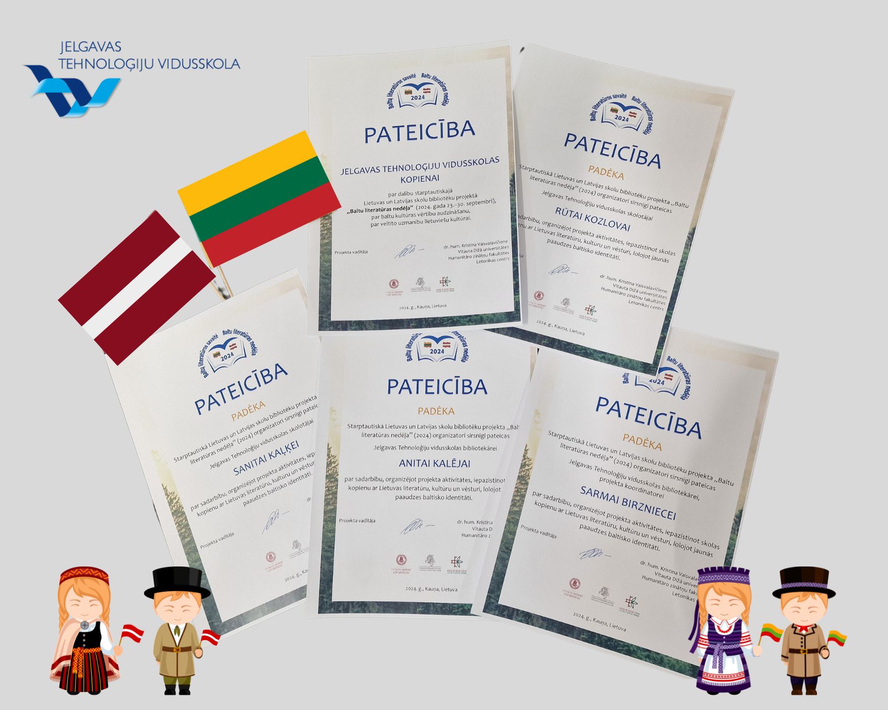 Starptautiskais skolu bibliotēku projekts „Baltų literatūros savaitė / Baltu literatūras nedēļa”, kurā piedalījās jau otro gadu mūsu skolas skolotāji un skolēni, saņēma pateicības rakstus no projekta organizatoriem. Turpināsim interesēties par kaimiņu vēsturi, kultūru, lasīsim lietuviešu rakstnieku grāmatas. Projekts tiek organizēts kopā ar Vītauta Dižā Universitātes Letonikas centru (Kauņa).