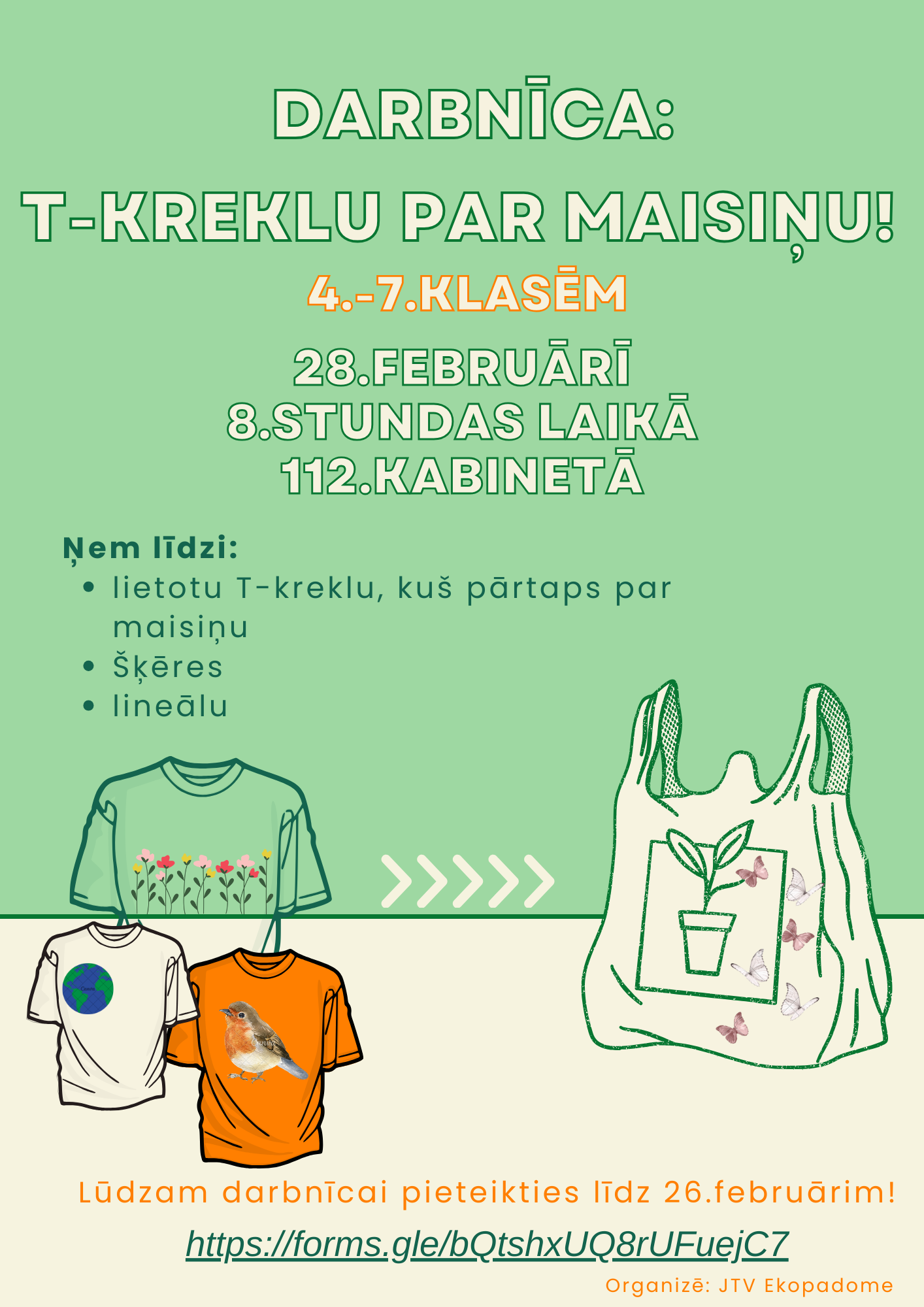28.februāra pēcpusdienā 4.-7.klašu skolēni darbojās skolas Ekopadomes rīkotajā radošajā darbnīcā "T-kreklu par maisiņu".