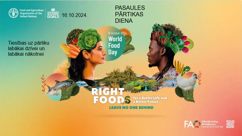 Pasaules pārtikas diena katru gadu tiek atzīmēta 16.oktobrī, lai veicinātu globālu izpratni un rīcību par pārtikas jomas izaicinājumiem, mazinātu badu un uzsvērtu nepieciešamību nodrošināt veselīgu un videi draudzīgu uzturu visiem.