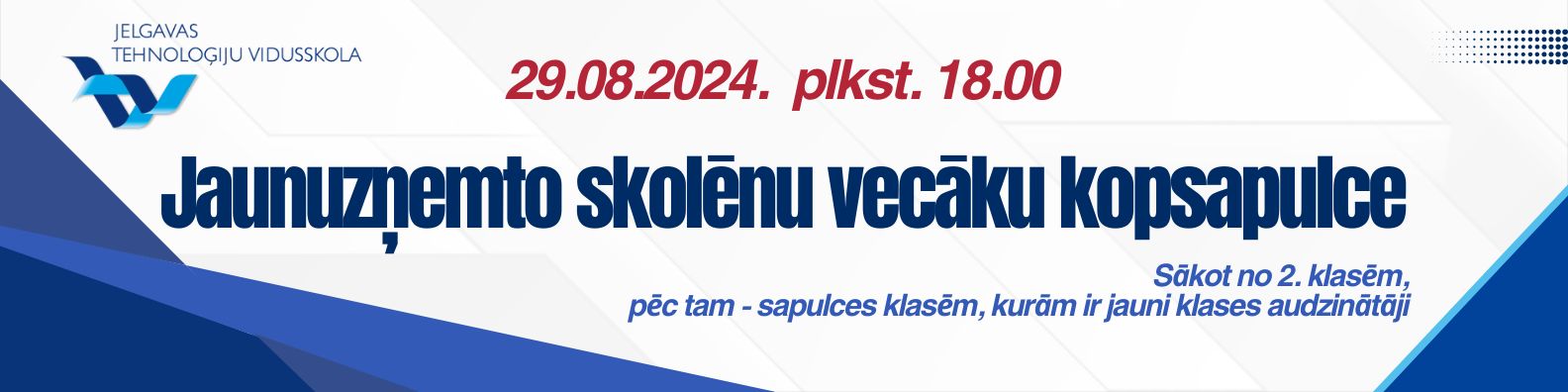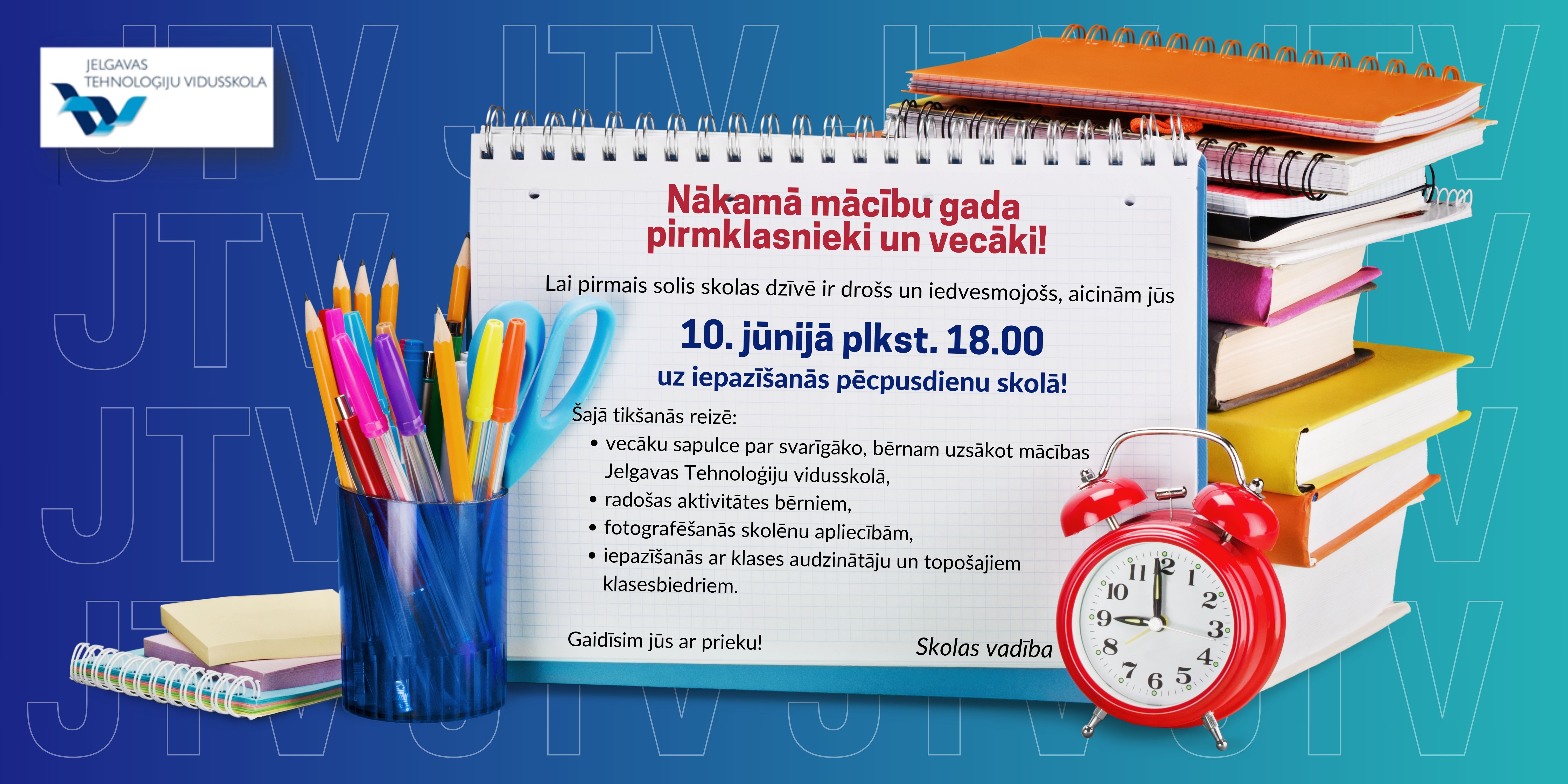 21. un 22.augustā Jelgavas Tehnoloģiju vidusskolas klašu telpas un gaiteņus pieskandināja pirmklasnieku balsis. Bērni kopā ar saviem nākamajiem klasesbiedriem iepazinās ar skolas vidi un telpām, kur pavadīs turpmākos gadus. Katrs rīts sākās ar nodarbībām pie klašu audzinātājām, iemēģinot skolas solu, iepazīstoties ar klasesbiedriem, klausoties skolotājas lasīto stāstu vai pasaku, pildot radošus uzdevumus, pārrunājot svarīgākos kārtības noteikumus. Kopā ar sporta skolotāju mazie devās apskatīt sporta zāles un stadionu, sportoja, savukārt deju skolotāja aicināja visus lielajā skolas zālē, kur varēja izkustēties deju ritmā. Ar interesi pirmklasnieki darbojās arī mūzikas, teātra, dizaina un vizuālās mākslas nodarbībās. Bērni atzina, ka skolā viņiem patīk un gaidīs pirmo skolas dienu, lai atkal satiktos ar savu klases audzinātāju un klasesbiedriem.