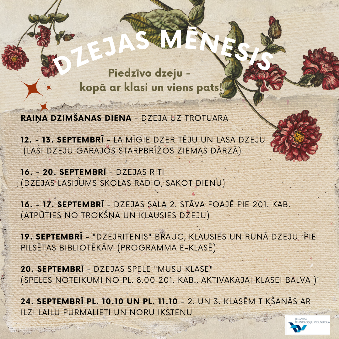 Dzejas mēnesis - septembris - ir bijis vasarīgi rosīgs. Dzeja kā šķelmīgi vasarasraibumi - gaiteņos, rīta radio, dažādās mācību stundās (ne tikai literatūrā).