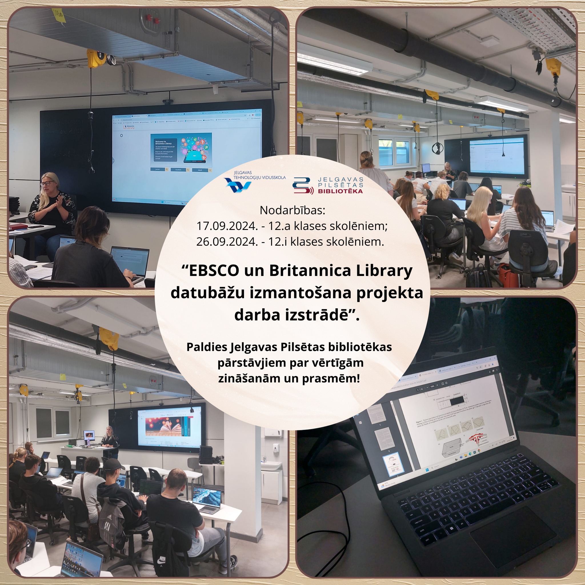 Paldies Jelgavas Pilsētas bibliotēkas pārstāvjiem par vērtīgajām zināšanām un prasmēm, ko guva 12.a. un 12.i. klases skolēni par EBSCO un Britannica Library datubāžu izmantošanu projekta darba izstrādē.