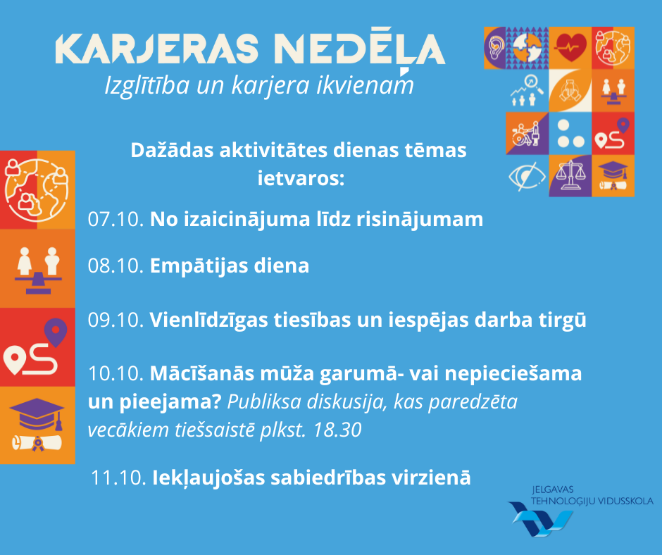 No 7. līdz 11.oktobrim, Latvijas skolās norisināsies ikgadējā Karjeras nedēļa, kuras tematika šogad būs "Izglītība un karjera ikvienam"!