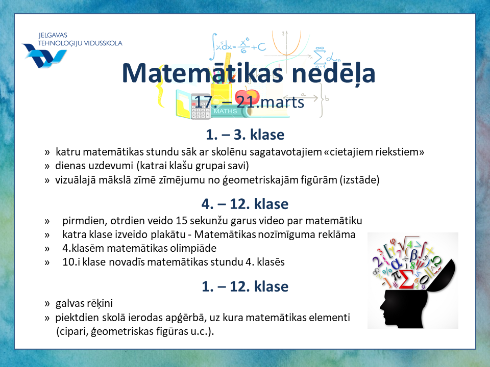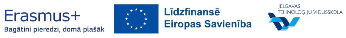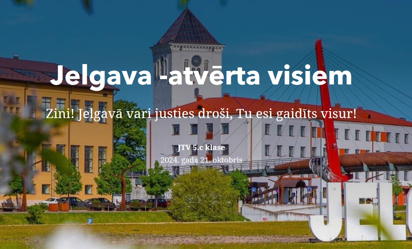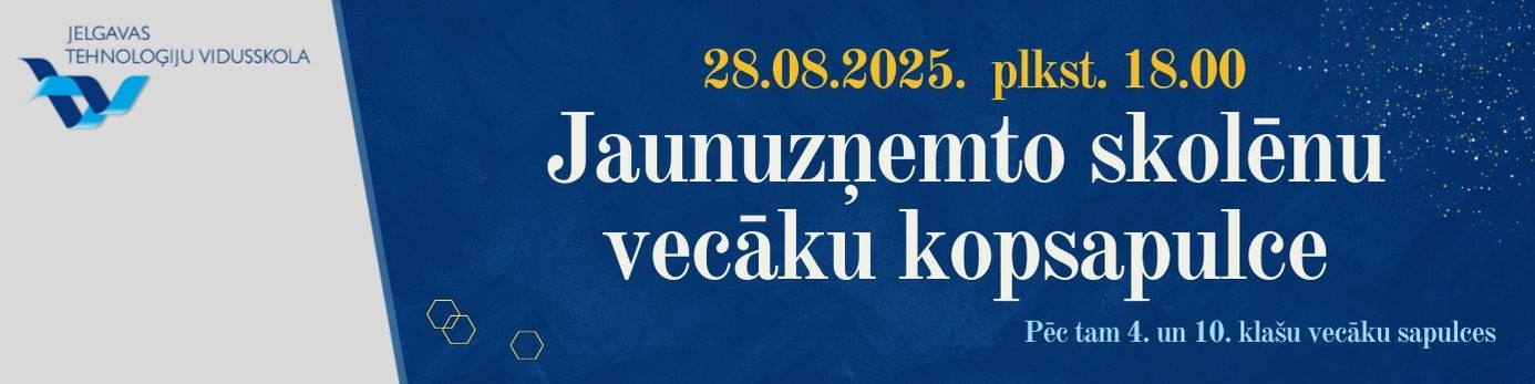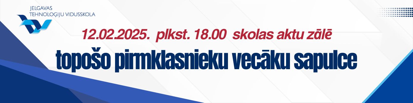 22.maijā 3.a un 3.f klase devās ekskursijā uz Ventspili, kur apmeklēja zinātnes centru "VIZIUM" - piedalījās radošajā darbnīcā un veidoja dažādas konstrukcijas (ēkas, tiltus u.c.). Skolēni zālē izmēģināja daudz dažādu aktivitāšu, pārbaudot savu veiklību, spēku un zināšanas. 22.05.2025. Atvērta reģistrēšanās Tehniski radošo darbu izstādei un Energoefektivitātes sacensībām "E-es". Ikviens interesents aicināts apmeklēt Bērnu un jauniešu Tehnoloģiju festivālu, kas norisināsies šī gada 8.jūnijā Jelgavā, teritorijā pie Ledus halles - atpūtas un sporta kompleksā "Zemgale" (Rīgas iela 11). 22.05.2025. 22.maijā Jelgavas Tehnoloģiju vidusskolas Atbalsta komanda pieņēma ciemiņus - Mārupes Valsts ģimnāzijas Atbalsta komandu. Speciālistu tikšanās mērķis bija neformālā vidē dalīties pieredzē un pārrunāt aktuālos izaicinājumus, ar kuriem saskaras speciālisti, sniedzot atbalstu skolēniem mācību un emocionālajā procesā. 22.05.2025. 22.maijā 7.c klase devās uz izcīnīto dalību Čē-Čē čempionāta finālu Bauskā, kur pulcējās 160 klases no visas Latvijas. Laiks bija fantastisks un pozitīvisma pārpilns. 21.05.2025. XIII Latvijas Skolu jaunatnes dziesmu un deju svētku vides objekta "Vijums" JTV pērles dodas "Savīšanās ceļā". 21.05.2025. Turpinot un papildinot Bišu nedēļas aktivitātes, Jauniešu uzņēmējdarbības un karjeras motivācijas centrs (JUKMC) izstrādājis īpašu darba lapu jaunāko klašu skolēniem. 20.05.2025. 20.05.2025. Burvīgi pavadīta diena saulainajā un ziedošajā Jelgavā! 20.05.2025. 3.a klase starpdisciplinārajā dienā devās uz Ā.Alunāna memoriālo muzeju. Skatījās, klausījās un spēlēja teātri. 20.05.2025. Gaidot Jelgavas pilsētas svētkus, 2.c un 2.d klase starpdiciplināro dienu pavadīja aktīvi darbojoties. 20.05.2025. 20.maijā ar 4.a klases skolēniem un skolotāju piedalījāmies starpdisciplinārā pārgājienā, kurā tika integrēta pilsētas svētku svinību un karjeras izglītības tēma. 20.05.2025. Atgādinot par bišu un citu apputeksnētāju svarīgo lomu un to aizsardzību, 20.maijā visā pasaulē atzīmē Pasaules bišu dienu, tāpēc līdz 23.maijam aicinām piedalīties Bišu nedēļas aktivitātēs: 20.05.2025. 20.05.2025. Latvijas skolu TOP 1. vietu iegūst JTV. 20.05.2025. 10.a klases skolēni mācību kursa "Kultūra un māksla" ietvaros, pēta Itālijas (Milānas) kultūras mantojumu. 19.05.2025. 16.05.2025. 16.05.2025. 9.maijā 4.e klases skolēni piedzīvoja aizraujošu dienu mežā, kur katrs solis veda tuvāk jaunam atklājumam. Meža pieturvietās skolēni ar prieku un aizrautību risināja uzdevumus, vēroja dabu un uzzināja daudz jauna par meža dzīvi. 15.05.2025. Māmiņ, mīlo, māmiņ, 14.05.2025. 10.maijā 2.d klase devās uz bērnu un jauniešu bibliotēku "Zinītis". Skolēni šajā mācību gadā aktīvi piedalījās Bērnu žūrijā, lasot un vērtējot izvirzītās grāmatas. Tādēļ bija liels prieks vērot bibliotēkas darbinieku sagatavoto leļļu izrādi pēc lasītās grāmatas "Mollis" motīviem. Aplūkojām arī jaunās 2025.gadā izvirzītās Bērnu žūrijas grāmatas, lai varam ķerties pie lasīšanas. Ekskursijas turpinājumā uzzinājām un izmēģinājām dažādas jaunās tehnoloģijas, kuras ieviestas bibliotēkas apmeklētāju ērtumam un drošībai. 13.05.2025. 2.c klase sestdien devās ekskursijā uz VUGD Jelgavas nodaļu. Bērni iepazinās ar ugunsdzēsēju – glābēju ikdienu, piemērīja aizsargtērpu, kā arī izpētīja glābēju automašīnas. Ar lielu interesi visu klausījās, skatījās, un izdarīja secinājumus, ka, šī profesija ir visbīstamākā, bet reizē arī visvajadzīgākā. 12.05.2025. 08.05.2025. 29.04.2025. 30.04.2025. 25.aprīlī sākumskolas metodiskā joma organizēja skolas kombinēto olimpiādi 2. un 3.klasēm, kur skolēni parādīja apgūtās zināšanas un prasmes matemātikā, latviešu valodā, dabaszinībās un sociālajās zinībās. 30.04.2025. 4.e klases skolēni gatavojas Meža ABC pasākumam. 29.04.2025. Mūsējā 7.c klase ir iekļuvusi Čē Čē čempionāta lielajā Finālā! Kas tas ir? 29.04.2025. 29.04.2025. 26.aprīlī Jelgavas Centra pamatskolā notika Nacionālās Skaļās lasīšanas sacensības Jelgavas reģiona 2.kārta. 28.04.2025. 28.aprīlī 12.klašu skolēni iepazinās ar karjeras iespējām valsts aizsardzības jomā. Liels paldies mūsu skolas absolventam Ērikam Antonevičam par aizraujošo un izsmeļošo stāstu! 28.04.2025. Soli pa solītim tuvojamies XIII Latvijas Skolu jaunatnes dziesmu un deju svētkiem. Bezgala priecājamies, ka mūsu skolā atkal ir koris. Šodien īpaši lepojamies ar kora lielisko sniegumu skatē! 28.04.2025. 24.04.2025. 23.04.2025. Pasakas nav tikai maziem bērniem - dzīves gudrības, ironija un pasmiešanās pašiem par sevi veikli slēpjas aiz pasaku tēlu kostīmiem. Skolas teātris "Melnā kaste" nosvinējis pirmizrādi - esam iestudējuši Hermaņa Paukša lugu "Pūķa brokastis". Un jau pabijuši viesizrādē festivālā "Brīnumzeme"! 23.04.2025. "Jelgava - pilsēta izaugsmei. Jelgavas 760.dzimšanas dienas gadā dizaina un tehnoloģiju stundās notikusi JTV skolēnu šūšanas prasmju izaugsme, attēlojot uz auduma Jelgavai raksturīgo, skolēniem nozīmīgo ēku un simbolu siluetus. 22.04.2025. 22.aprīlī 8.c klases organizētajā Akmeņu apgleznošanas meistarklasē piedalījās gan dažādu klašu skolēni, gan arī skolotāji. 22.04.2025. Kursa "Publiskā uzstāšanās" ietvaros 11.a klases skolēniem bija iespēja viesoties Latvijas Nacionālajā operā un tuvāk iepazīt plašo skatuvi, skatuves apgaismojuma iespējas, Jauno zāli, gremdētavu, gaismas režijas telpas. 22.04.2025. Latvijas erudītākie jaunieši eksaktajās zinātnēs mācās Jelgavas Tehnoloģiju vidusskolā! 22.04.2025. JTV jaunie matemātiķi piedalās LU konkursā NNV. 22.04.2025. 22.04.2025. 22.04.2025. Jelgavas Tehnoloģiju v