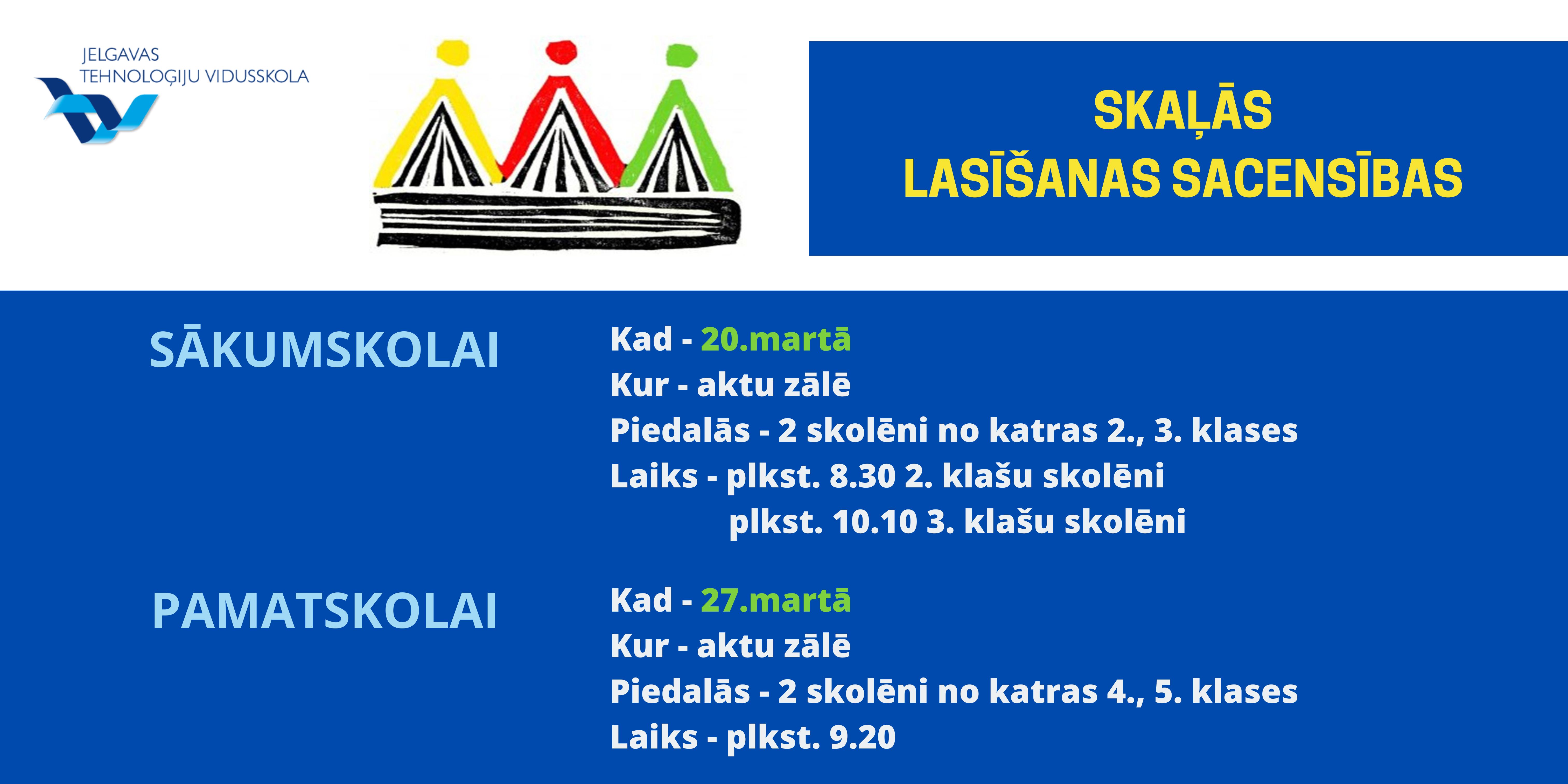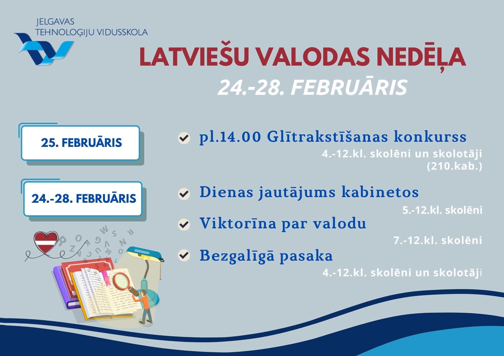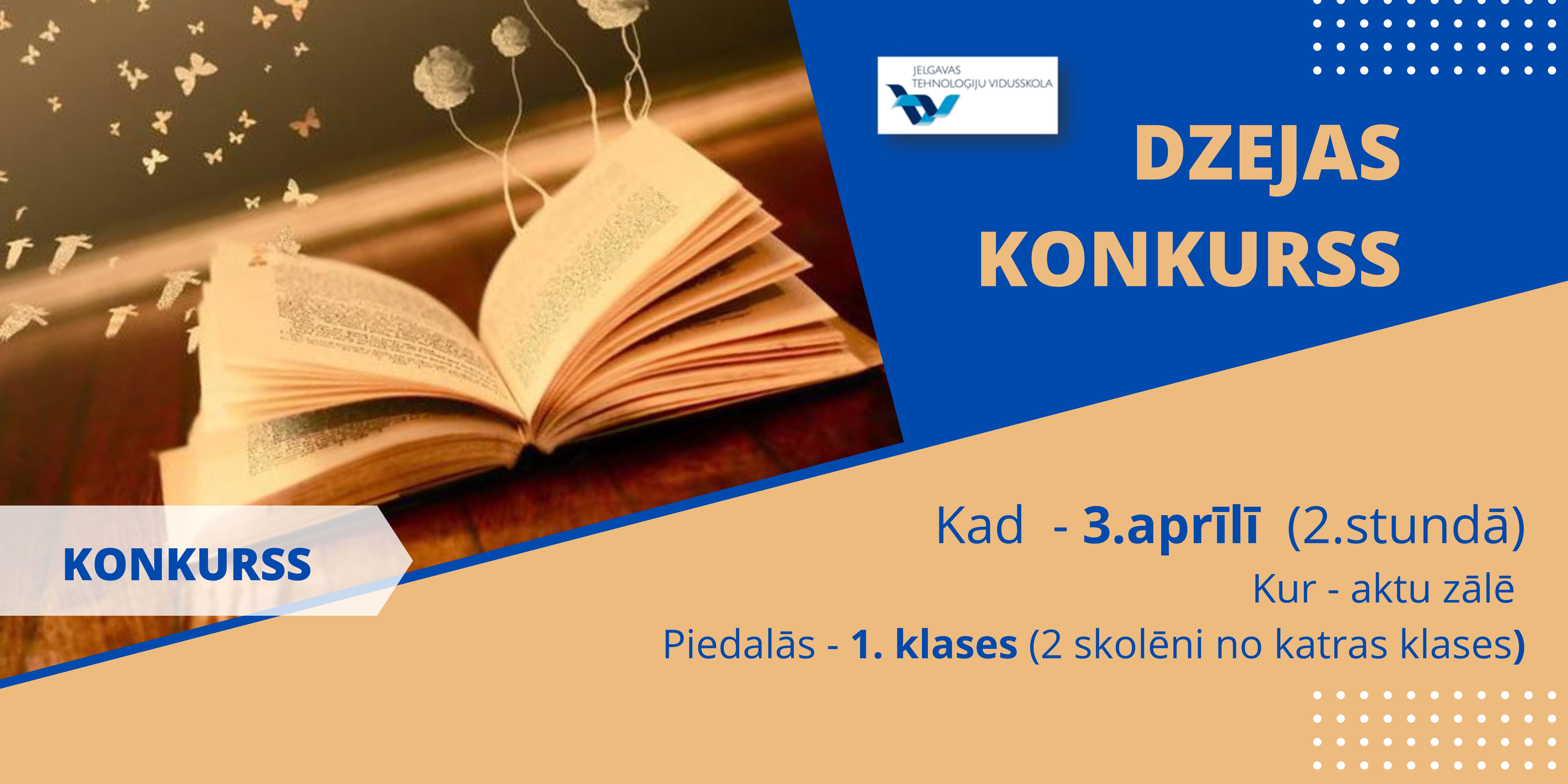 22.maijā 3.a un 3.f klase devās ekskursijā uz Ventspili, kur apmeklēja zinātnes centru "VIZIUM" - piedalījās radošajā darbnīcā un veidoja dažādas konstrukcijas (ēkas, tiltus u.c.). Skolēni zālē izmēģināja daudz dažādu aktivitāšu, pārbaudot savu veiklību, spēku un zināšanas. 22.05.2025. Atvērta reģistrēšanās Tehniski radošo darbu izstādei un Energoefektivitātes sacensībām "E-es". Ikviens interesents aicināts apmeklēt Bērnu un jauniešu Tehnoloģiju festivālu, kas norisināsies šī gada 8.jūnijā Jelgavā, teritorijā pie Ledus halles - atpūtas un sporta kompleksā "Zemgale" (Rīgas iela 11). 22.05.2025. 22.maijā Jelgavas Tehnoloģiju vidusskolas Atbalsta komanda pieņēma ciemiņus - Mārupes Valsts ģimnāzijas Atbalsta komandu. Speciālistu tikšanās mērķis bija neformālā vidē dalīties pieredzē un pārrunāt aktuālos izaicinājumus, ar kuriem saskaras speciālisti, sniedzot atbalstu skolēniem mācību un emocionālajā procesā. 22.05.2025. 22.maijā 7.c klase devās uz izcīnīto dalību Čē-Čē čempionāta finālu Bauskā, kur pulcējās 160 klases no visas Latvijas. Laiks bija fantastisks un pozitīvisma pārpilns. 21.05.2025. XIII Latvijas Skolu jaunatnes dziesmu un deju svētku vides objekta "Vijums" JTV pērles dodas "Savīšanās ceļā". 21.05.2025. Turpinot un papildinot Bišu nedēļas aktivitātes, Jauniešu uzņēmējdarbības un karjeras motivācijas centrs (JUKMC) izstrādājis īpašu darba lapu jaunāko klašu skolēniem. 20.05.2025. 20.05.2025. Burvīgi pavadīta diena saulainajā un ziedošajā Jelgavā! 20.05.2025. 3.a klase starpdisciplinārajā dienā devās uz Ā.Alunāna memoriālo muzeju. Skatījās, klausījās un spēlēja teātri. 20.05.2025. Gaidot Jelgavas pilsētas svētkus, 2.c un 2.d klase starpdiciplināro dienu pavadīja aktīvi darbojoties. 20.05.2025. 20.maijā ar 4.a klases skolēniem un skolotāju piedalījāmies starpdisciplinārā pārgājienā, kurā tika integrēta pilsētas svētku svinību un karjeras izglītības tēma. 20.05.2025. Atgādinot par bišu un citu apputeksnētāju svarīgo lomu un to aizsardzību, 20.maijā visā pasaulē atzīmē Pasaules bišu dienu, tāpēc līdz 23.maijam aicinām piedalīties Bišu nedēļas aktivitātēs: 20.05.2025. 20.05.2025. Latvijas skolu TOP 1. vietu iegūst JTV. 20.05.2025. 10.a klases skolēni mācību kursa "Kultūra un māksla" ietvaros, pēta Itālijas (Milānas) kultūras mantojumu. 19.05.2025. 16.05.2025. 16.05.2025. 9.maijā 4.e klases skolēni piedzīvoja aizraujošu dienu mežā, kur katrs solis veda tuvāk jaunam atklājumam. Meža pieturvietās skolēni ar prieku un aizrautību risināja uzdevumus, vēroja dabu un uzzināja daudz jauna par meža dzīvi. 15.05.2025. Māmiņ, mīlo, māmiņ, 14.05.2025. 10.maijā 2.d klase devās uz bērnu un jauniešu bibliotēku "Zinītis". Skolēni šajā mācību gadā aktīvi piedalījās Bērnu žūrijā, lasot un vērtējot izvirzītās grāmatas. Tādēļ bija liels prieks vērot bibliotēkas darbinieku sagatavoto leļļu izrādi pēc lasītās grāmatas "Mollis" motīviem. Aplūkojām arī jaunās 2025.gadā izvirzītās Bērnu žūrijas grāmatas, lai varam ķerties pie lasīšanas. Ekskursijas turpinājumā uzzinājām un izmēģinājām dažādas jaunās tehnoloģijas, kuras ieviestas bibliotēkas apmeklētāju ērtumam un drošībai. 13.05.2025. 2.c klase sestdien devās ekskursijā uz VUGD Jelgavas nodaļu. Bērni iepazinās ar ugunsdzēsēju – glābēju ikdienu, piemērīja aizsargtērpu, kā arī izpētīja glābēju automašīnas. Ar lielu interesi visu klausījās, skatījās, un izdarīja secinājumus, ka, šī profesija ir visbīstamākā, bet reizē arī visvajadzīgākā. 12.05.2025. 08.05.2025. 29.04.2025. 30.04.2025. 25.aprīlī sākumskolas metodiskā joma organizēja skolas kombinēto olimpiādi 2. un 3.klasēm, kur skolēni parādīja apgūtās zināšanas un prasmes matemātikā, latviešu valodā, dabaszinībās un sociālajās zinībās. 30.04.2025. 4.e klases skolēni gatavojas Meža ABC pasākumam. 29.04.2025. Mūsējā 7.c klase ir iekļuvusi Čē Čē čempionāta lielajā Finālā! Kas tas ir? 29.04.2025. 29.04.2025. 26.aprīlī Jelgavas Centra pamatskolā notika Nacionālās Skaļās lasīšanas sacensības Jelgavas reģiona 2.kārta. 28.04.2025. 28.aprīlī 12.klašu skolēni iepazinās ar karjeras iespējām valsts aizsardzības jomā. Liels paldies mūsu skolas absolventam Ērikam Antonevičam par aizraujošo un izsmeļošo stāstu! 28.04.2025. Soli pa solītim tuvojamies XIII Latvijas Skolu jaunatnes dziesmu un deju svētkiem. Bezgala priecājamies, ka mūsu skolā atkal ir koris. Šodien īpaši lepojamies ar kora lielisko sniegumu skatē! 28.04.2025. 24.04.2025. 23.04.2025. Pasakas nav tikai maziem bērniem - dzīves gudrības, ironija un pasmiešanās pašiem par sevi veikli slēpjas aiz pasaku tēlu kostīmiem. Skolas teātris "Melnā kaste" nosvinējis pirmizrādi - esam iestudējuši Hermaņa Paukša lugu "Pūķa brokastis". Un jau pabijuši viesizrādē festivālā "Brīnumzeme"! 23.04.2025. "Jelgava - pilsēta izaugsmei. Jelgavas 760.dzimšanas dienas gadā dizaina un tehnoloģiju stundās notikusi JTV skolēnu šūšanas prasmju izaugsme, attēlojot uz auduma Jelgavai raksturīgo, skolēniem nozīmīgo ēku un simbolu siluetus. 22.04.2025. 22.aprīlī 8.c klases organizētajā Akmeņu apgleznošanas meistarklasē piedalījās gan dažādu klašu skolēni, gan arī skolotāji. 22.04.2025. Kursa "Publiskā uzstāšanās" ietvaros 11.a klases skolēniem bija iespēja viesoties Latvijas Nacionālajā operā un tuvāk iepazīt plašo skatuvi, skatuves apgaismojuma iespējas, Jauno zāli, gremdētavu, gaismas režijas telpas. 22.04.2025. Latvijas erudītākie jaunieši eksaktajās zinātnēs mācās Jelgavas Tehnoloģiju vidusskolā! 22.04.2025. JTV jaunie matemātiķi piedalās LU konkursā NNV. 22.04.2025. 22.04.2025. 22.04.2025. Jelgavas Tehnoloģiju v