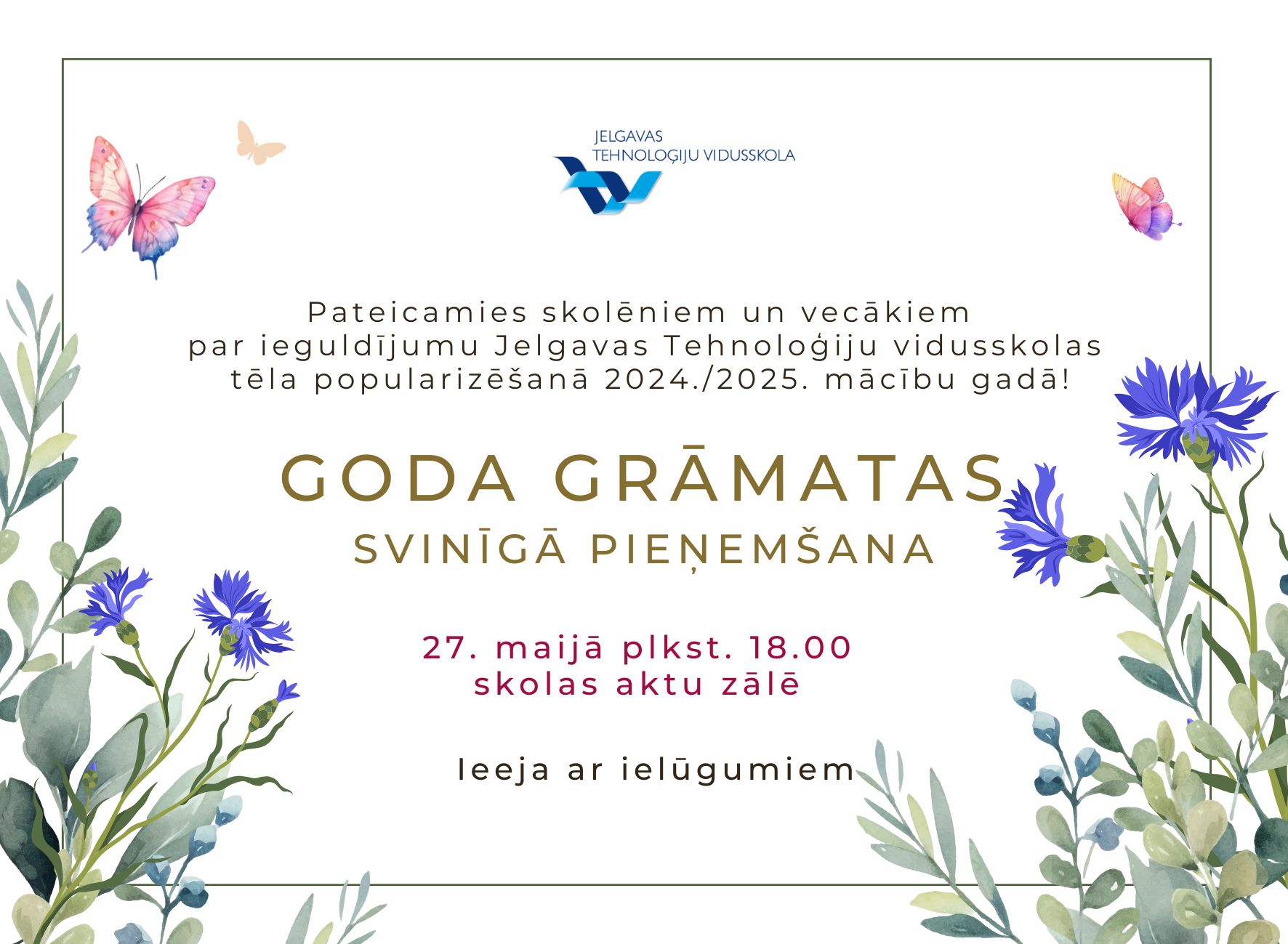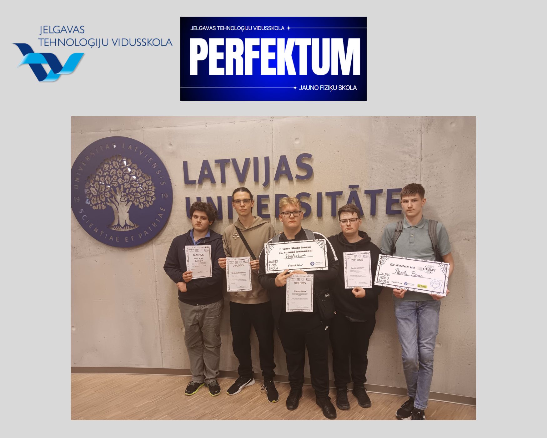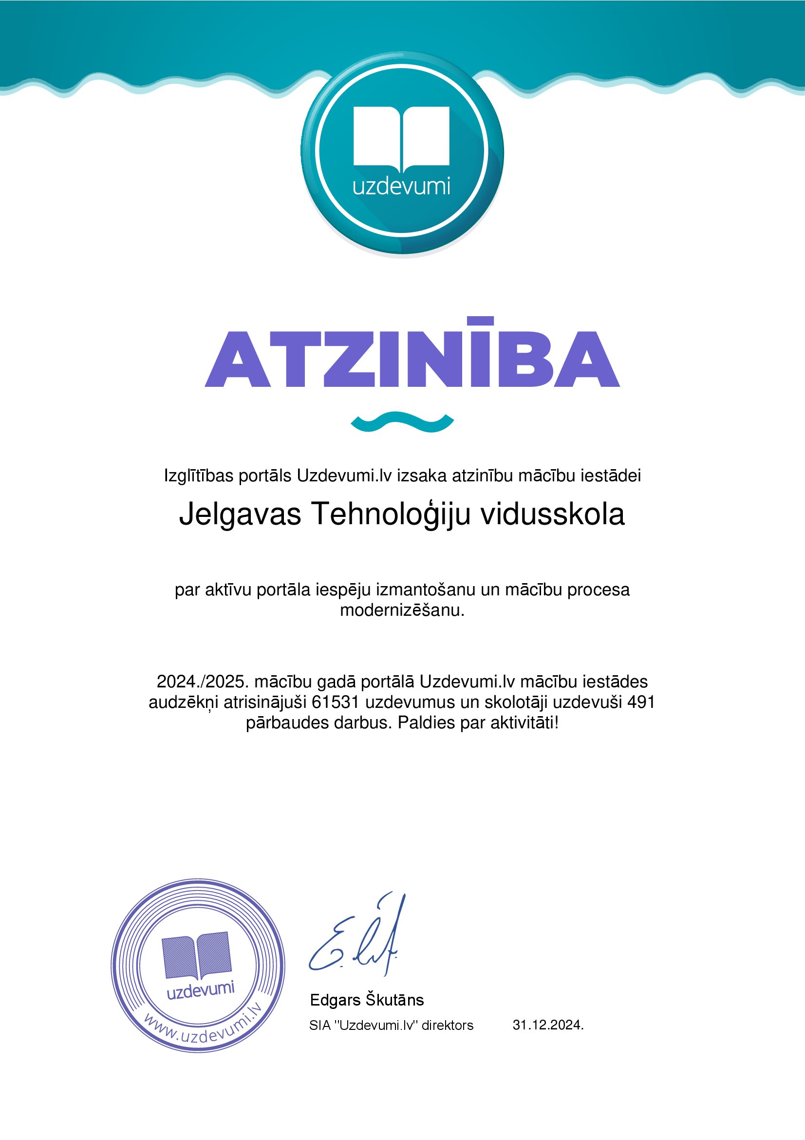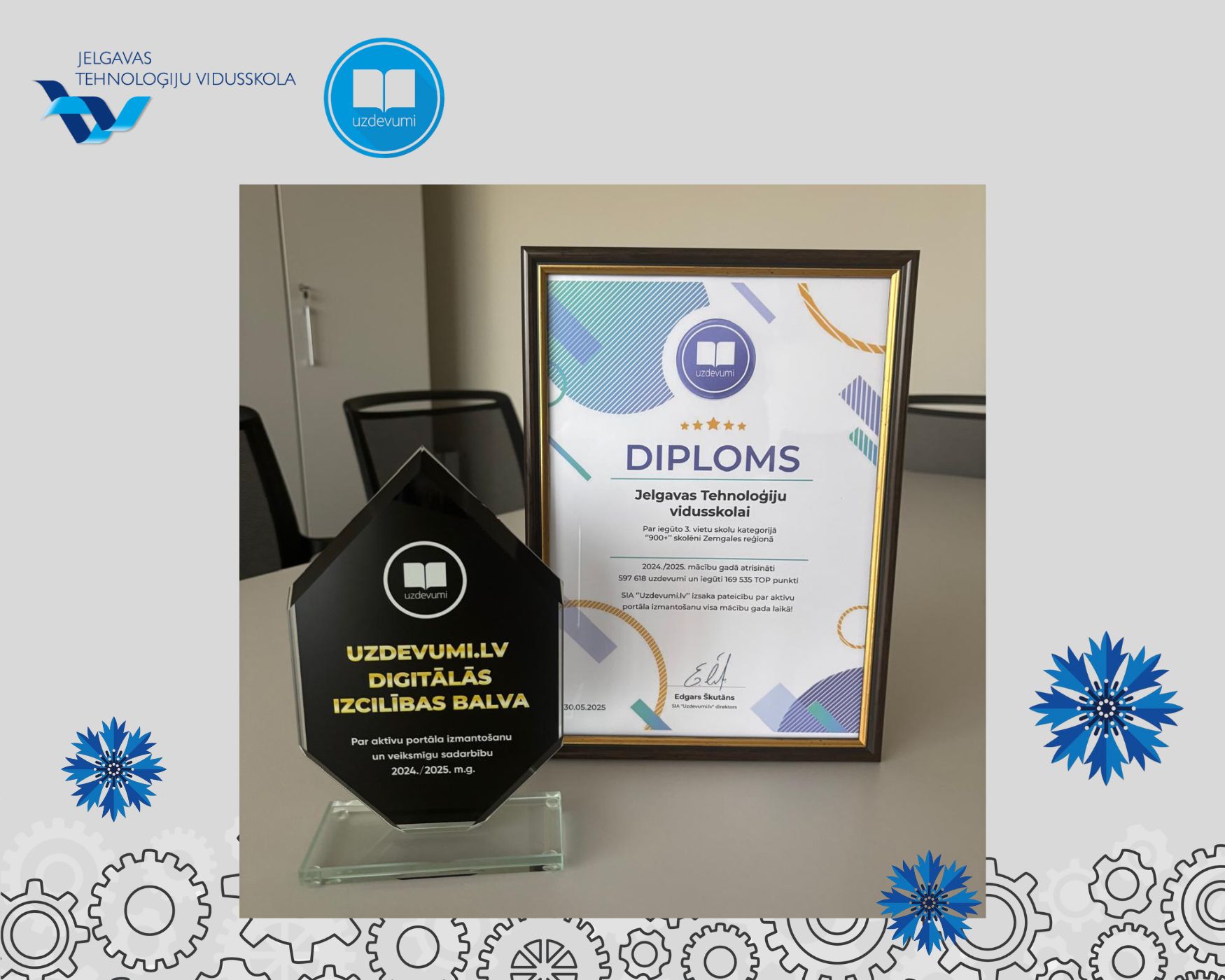 4.jūnijā Jelgavas Tehnoloģiju vidusskola saņēma Digitālās izcilības balvu par aktīvu portāla izmantošanu un veiksmīgu sadarbību 2024./ 2025. m.g. un diplomu par iegūto 3.vietu skolu kategorijā "900+" skolēni Zemgales reģionā.