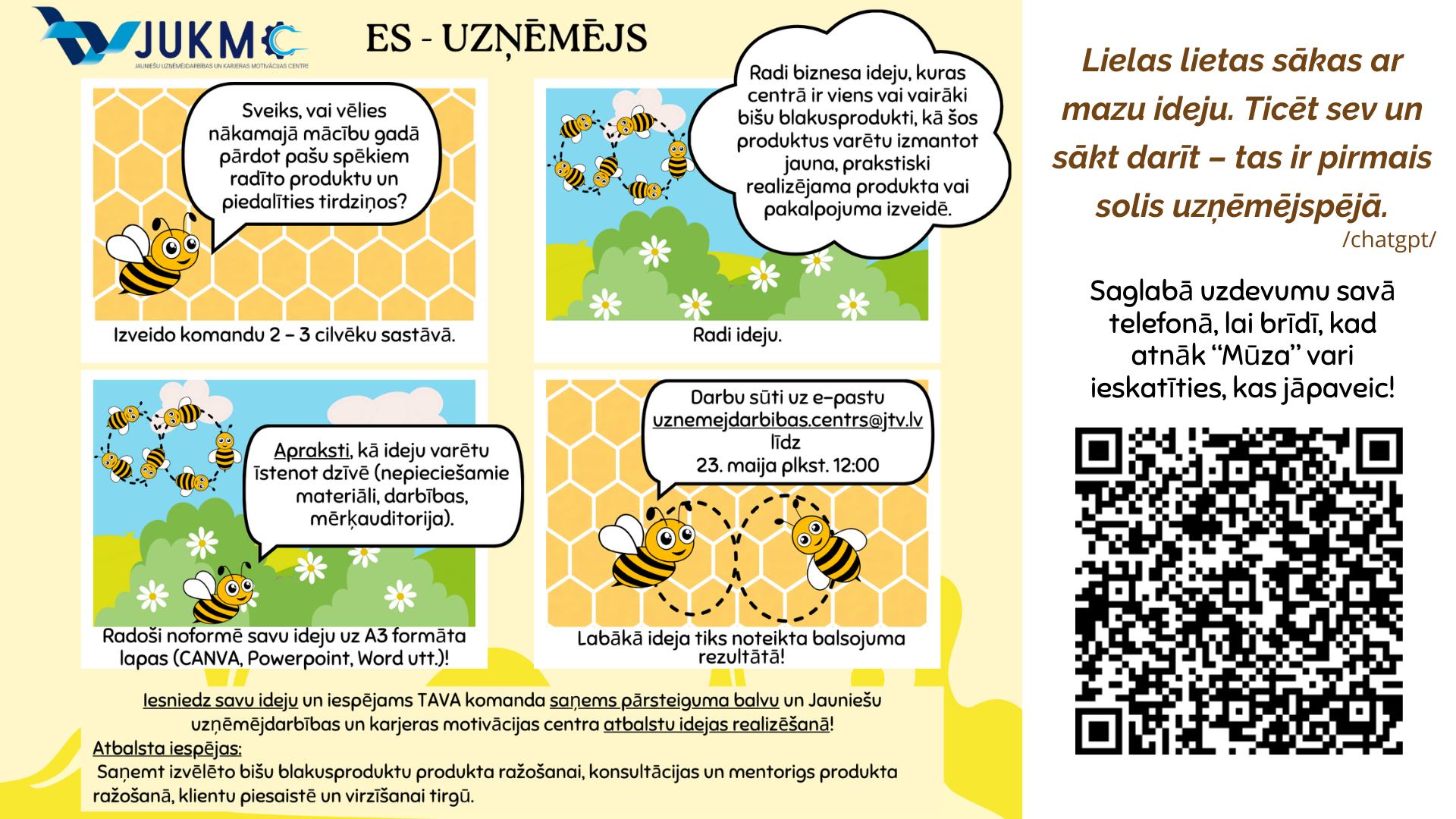 - "ES - UZŅĒMĒJS" - Radi biznesa ideju, kuras centrā ir viens vai vairāki bišu blakusprodukti.