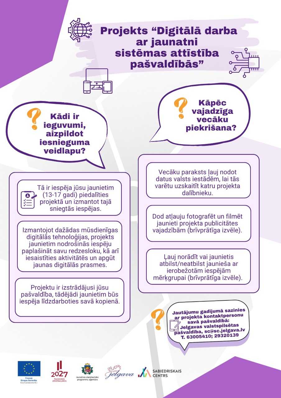 Jelgavas pašvaldība īsteno projektu "Digitālā darba ar jaunatni sistēmas attīstība pašvaldībās", kura mērķis ir veicināt jauniešu līdzdalību, kā arī stiprināt un attīstīt jaunatnes tehnoloģiju un inovāciju spējas. Viena no projekta aktivitātēm ir festivāls "Digifest", kas sniegs plašu ieskatu par pilnveides iespējām digitālajā vidē, tostarp jaunajām tehnoloģijām, sadarbības iespējām ar dažādām organizācijām un ieteikumiem no pieredzējušiem satura veidotājiem.