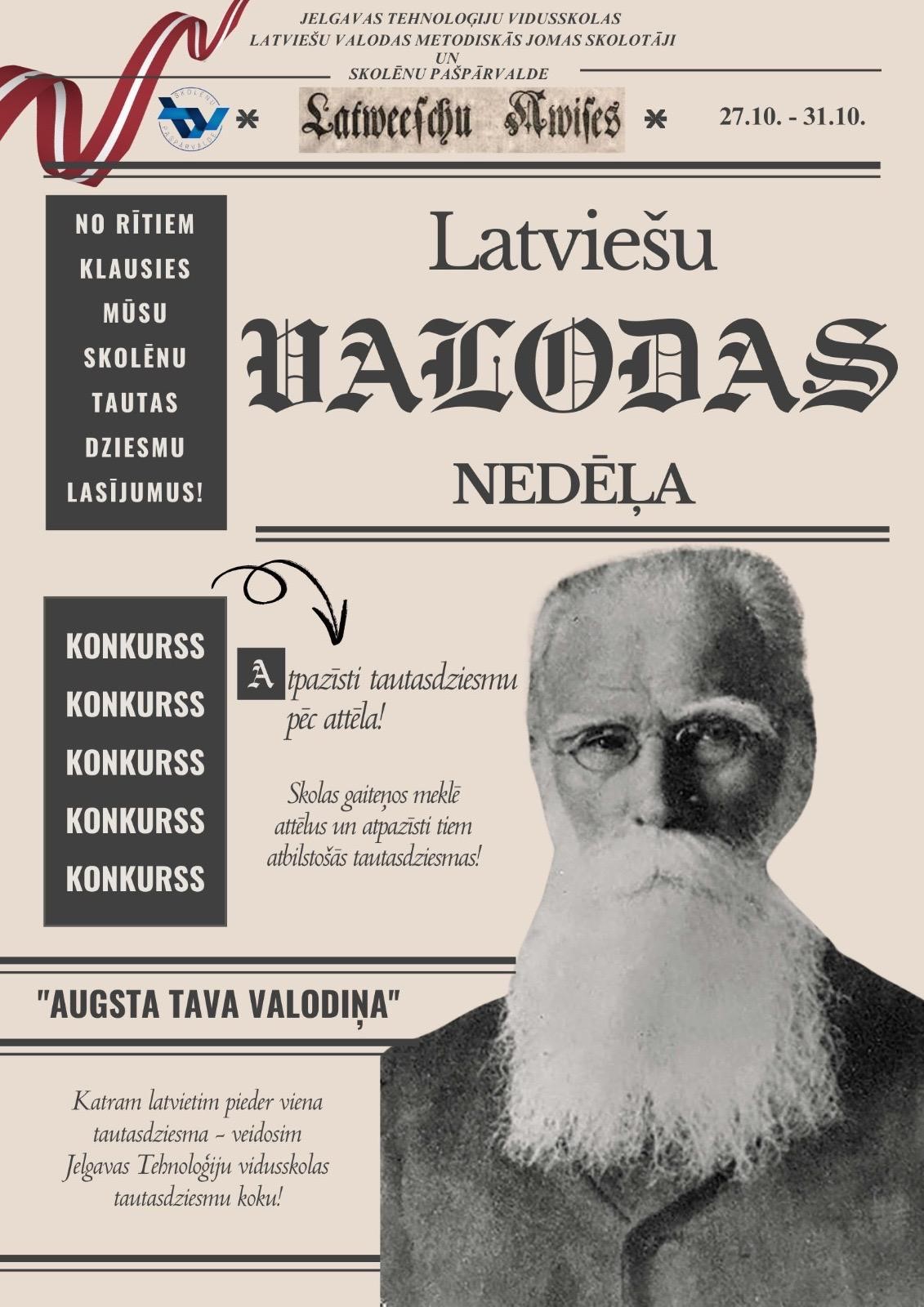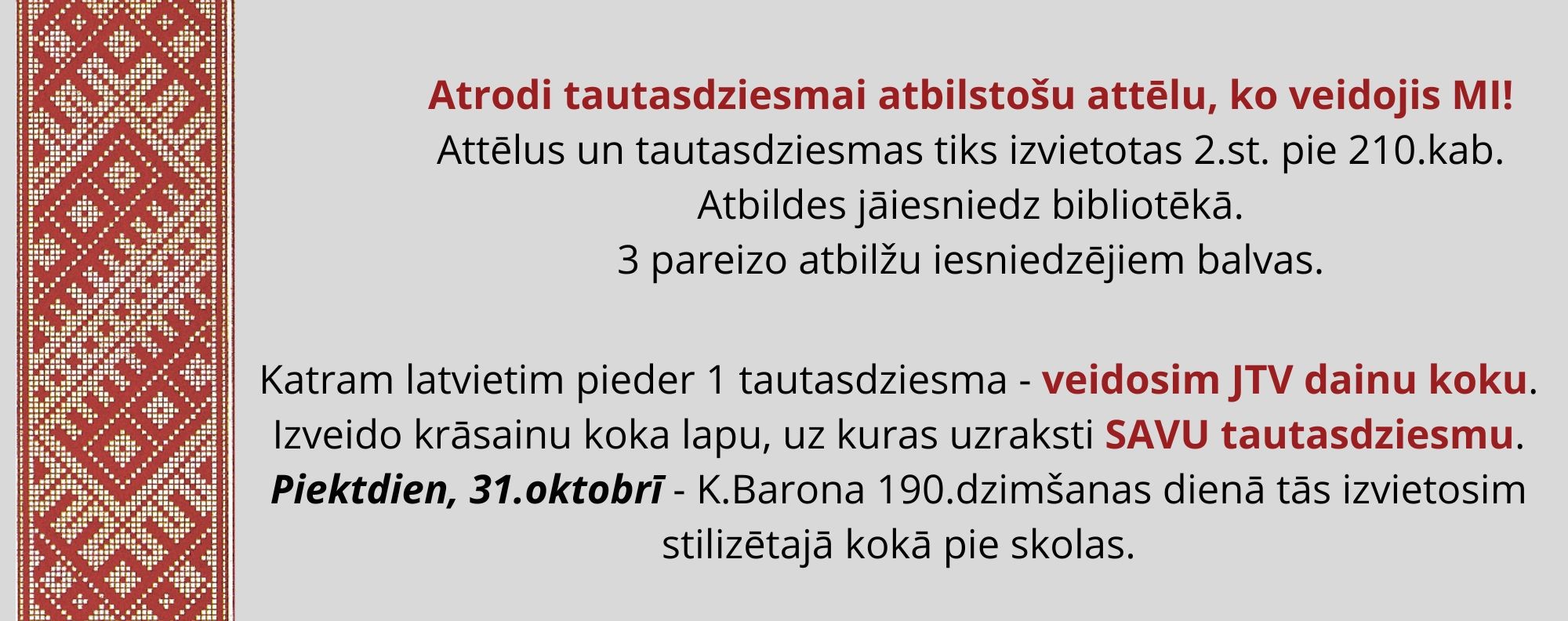 Visas nedēļas laikā varēja piedalīties konkursā "Atpazīsti tautasdziesmu pēc MI veidotas ilustrācijas". Aktīvākās klases bija 8.b, 7.c un 4.e, kuras saņēma nelielas balvas – galda spēli "Desas". Individuālo dalībnieku bija daudz, bet izlozes kārtā 5 saņēma individuālas balvas. Tie ir – Tince Bendrate (5.d), Ulla Melvere (4.e) Ainars Larionovs (5.a), Viesturs Bleifelds (7.a) un Gabriela Vjurkova (7.c). Pārējie pareizo atbilžu autori saņems Pateicības. Tieši K.Barona 190.dzimšanas dienā – 31.oktobrī – veidojām pie skolas Jelgavas Tehnoloģiju vidusskolas Dainu koku.
