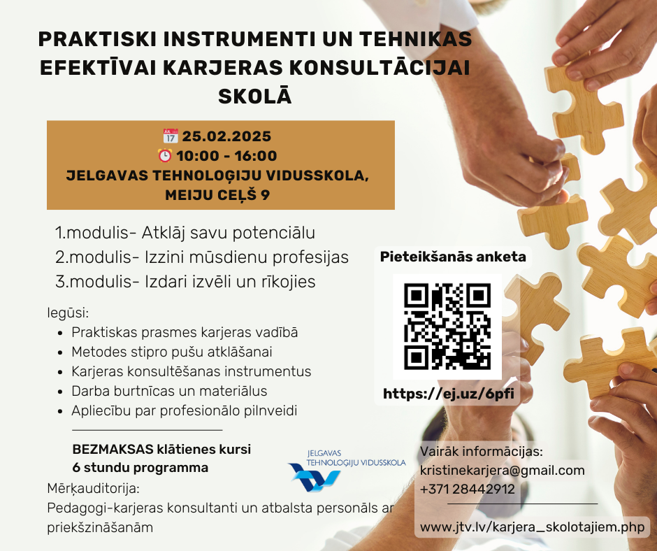 Aicinām pedagogus-karjeras konsultantus un/vai atbalsta personālu kursos "Praktiski instrumenti un tehnikas efektīvas karjeras konsultācijas skolā", kas notiks 2025. gada 25. februārī no plkst. 10.00 līdz 16.00, Jelgavas Tehnoloģiju vidusskolā (Meiju ceļš 9, Jelgava).